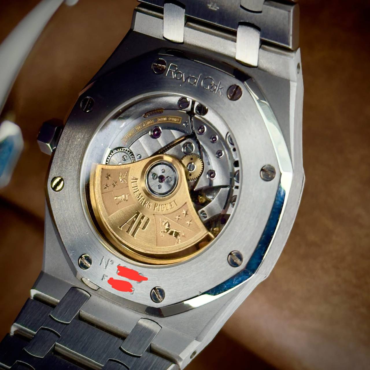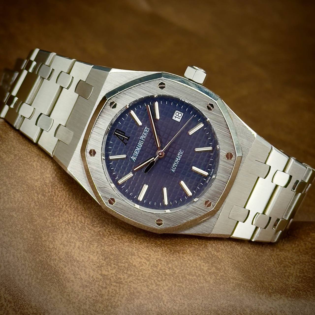 Crafted from high‑grade stainless steel, the case and integrated bracelet combine robustness with a luxurious finish. The interplay of brushed and polished surfaces across the case, bezel, and bracelet showcases the high level of finishing Audemars Piguet is known for. The sapphire crystal ensures durability and clear viewing of the finely detailed dial.