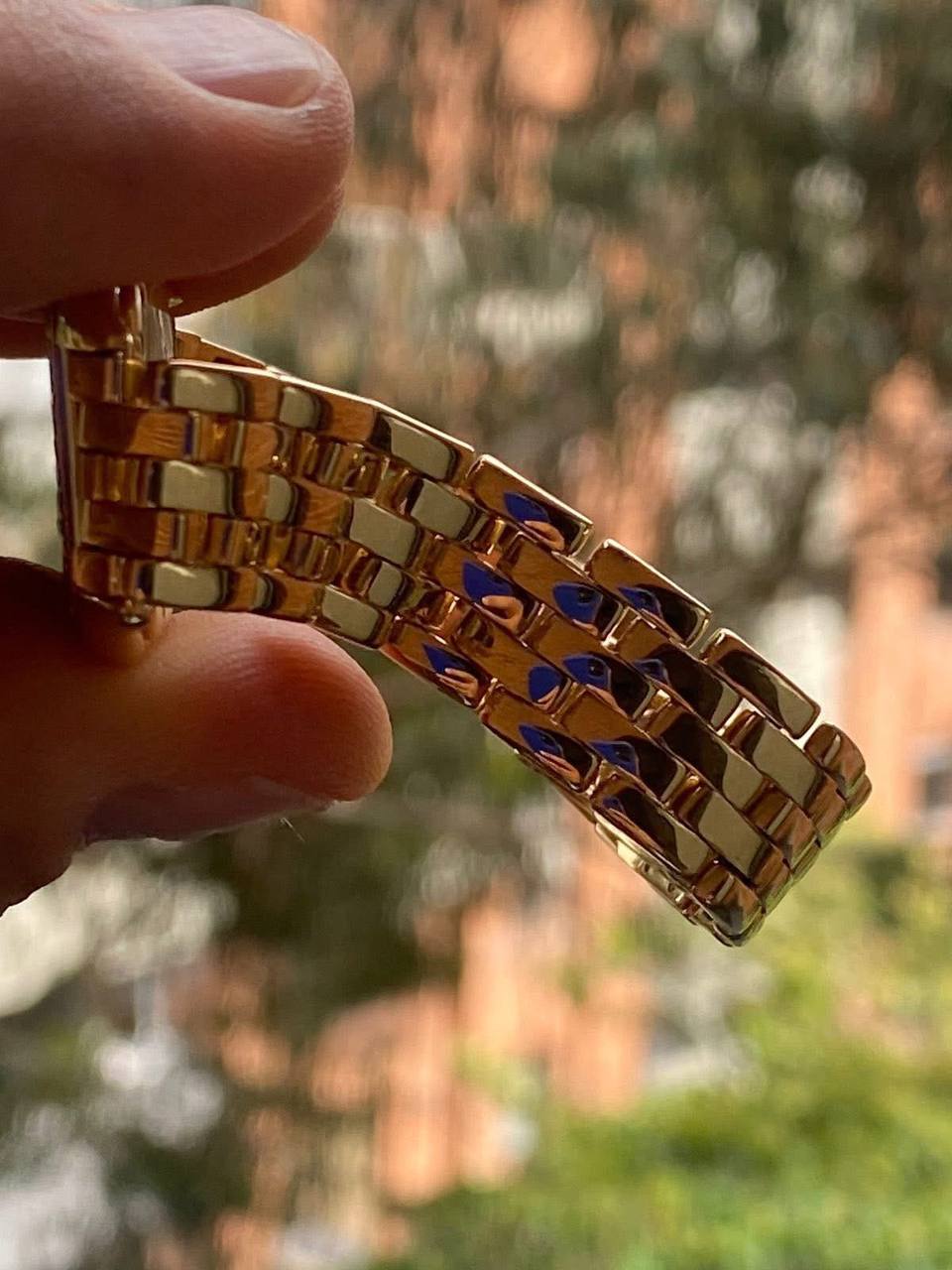 Interlinked yellow gold bracelet wrist par comfortable aur stylish fit deta hai. Crown me blue cabochon stone Cartier ka signature flourish hai, jo design ko complete karta hai.