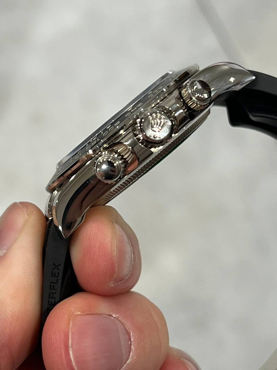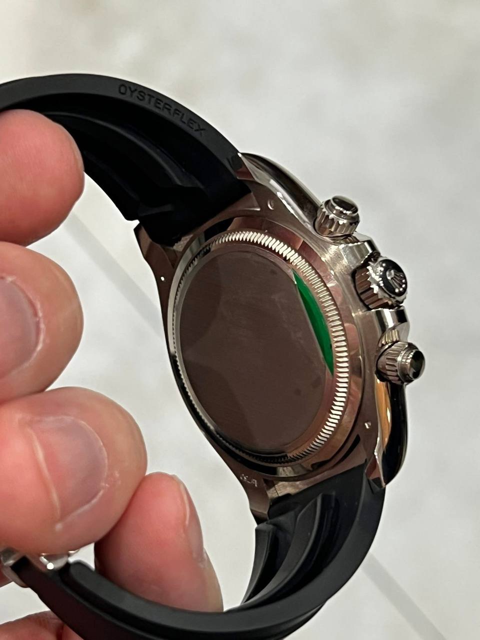 Rather than a traditional metal bracelet, this Daytona is equipped with an Oysterflex strap, a high‑performance elastomer band developed by Rolex to combine the comfort of rubber with the resilience of metal.