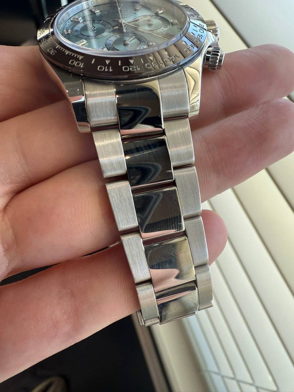 The Daytona Platinum Dial Chronograph begins with its extraordinary case material: platinum. Platinum is one of the rarest and most valuable metals used in watchmaking, known for its remarkable density, weight, and luminous finish. Unlike steel or gold, platinum radiates a unique brilliance that only deepens with time, making every glance at this watch an experience in luxury.