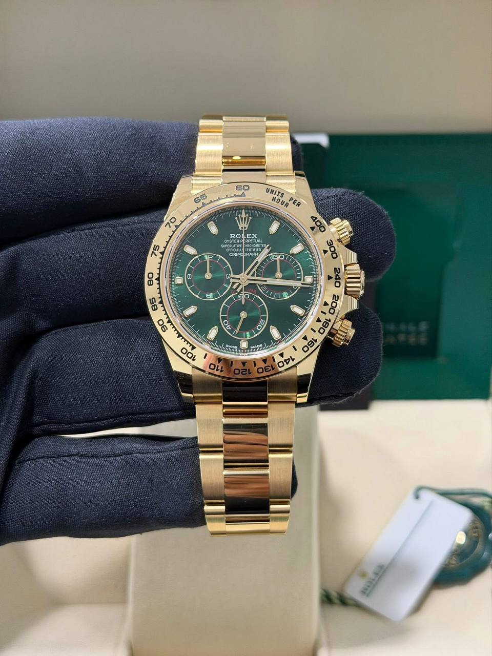 The Rolex Cosmograph Daytona Yellow Gold with Green Dial Oyster Perpetual Chronograph is a remarkable fusion of performance, style, and prestige. Celebrated around the world as one of the most iconic chronograph watches ever made, the Daytona has been synonymous with speed, precision, and motorsport heritage for decades. This stunning yellow gold version with a rich green dial elevates the model to new heights of luxury and distinction.