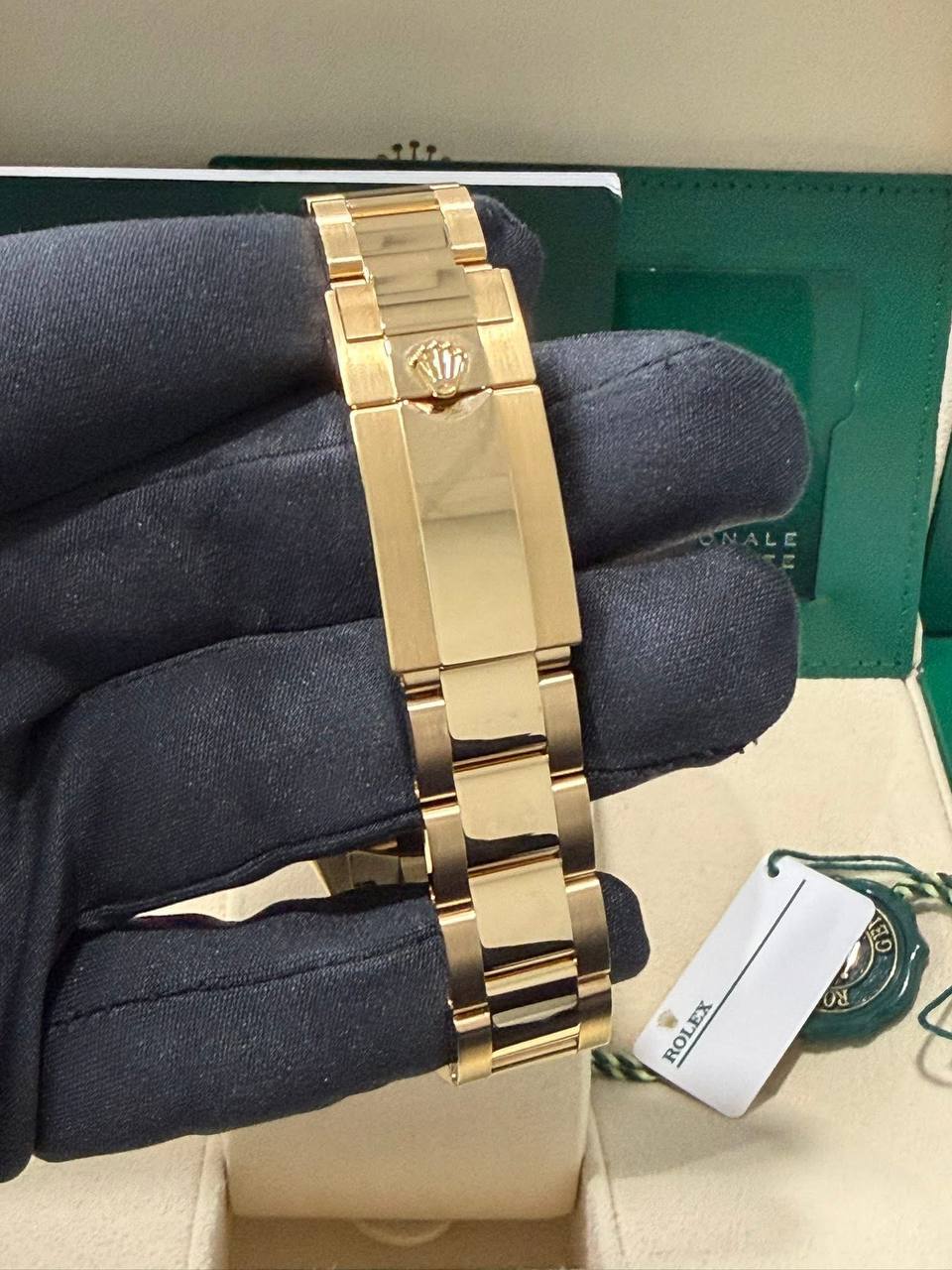 The watch is fitted with Rolex’s iconic Oyster bracelet — a hallmark of durability, comfort, and timeless design. Each link is precisely machined and finished to match the brilliance of the case, offering a secure and comfortable fit on the wrist.
